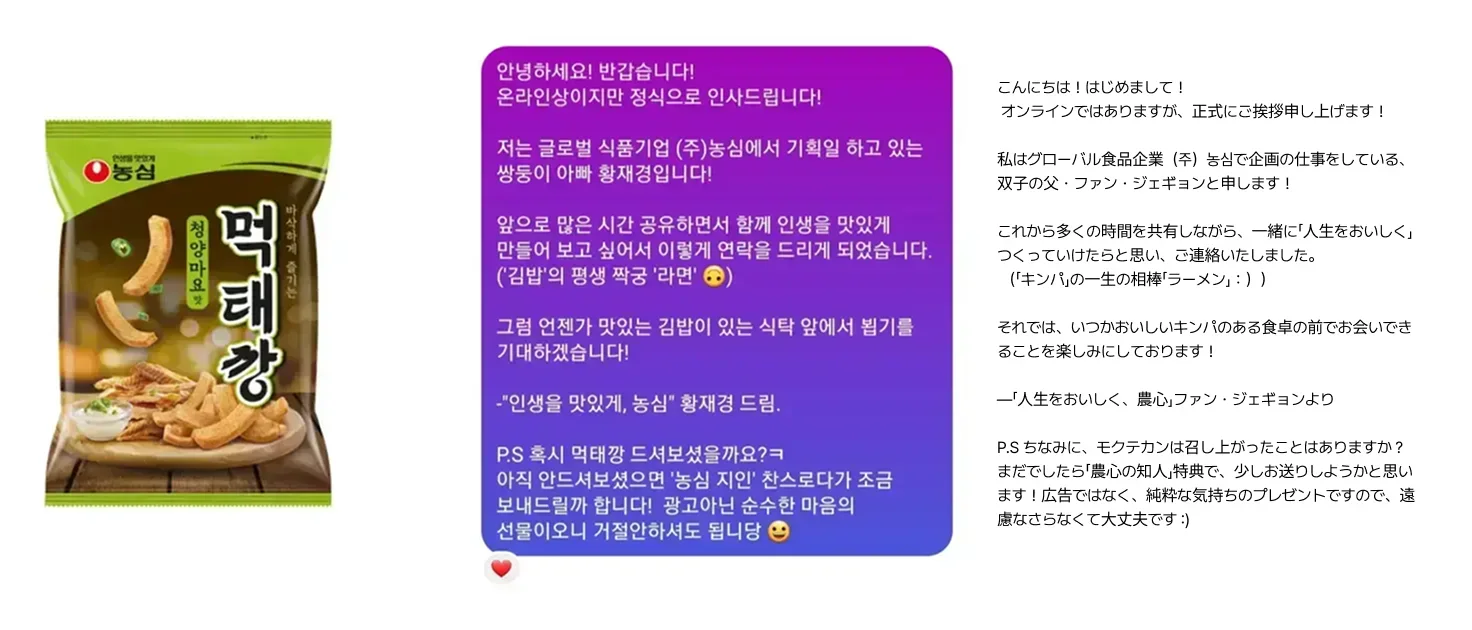 発売初期、農心はマイクロインフルエンサーに対して、個別にパーソナライズしたメッセージを送り、協業を提案しました。