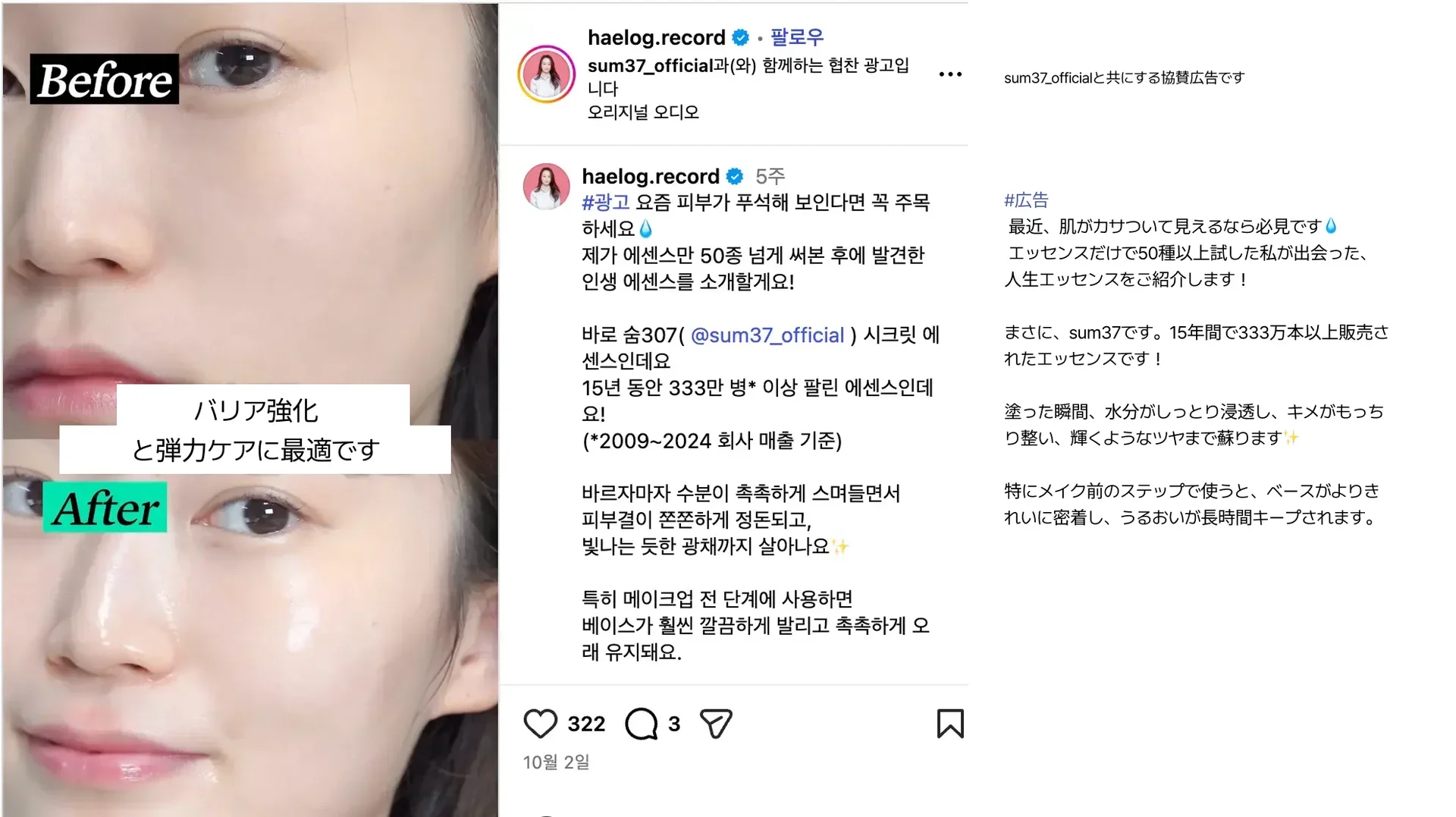 実際に、韓国のビューティーブランド「숨37」は、商品のUSPを軸に尖ったシーディングコンテンツを発掘し、パフォーマンスマーケティングまで連携して成果を創出しました。