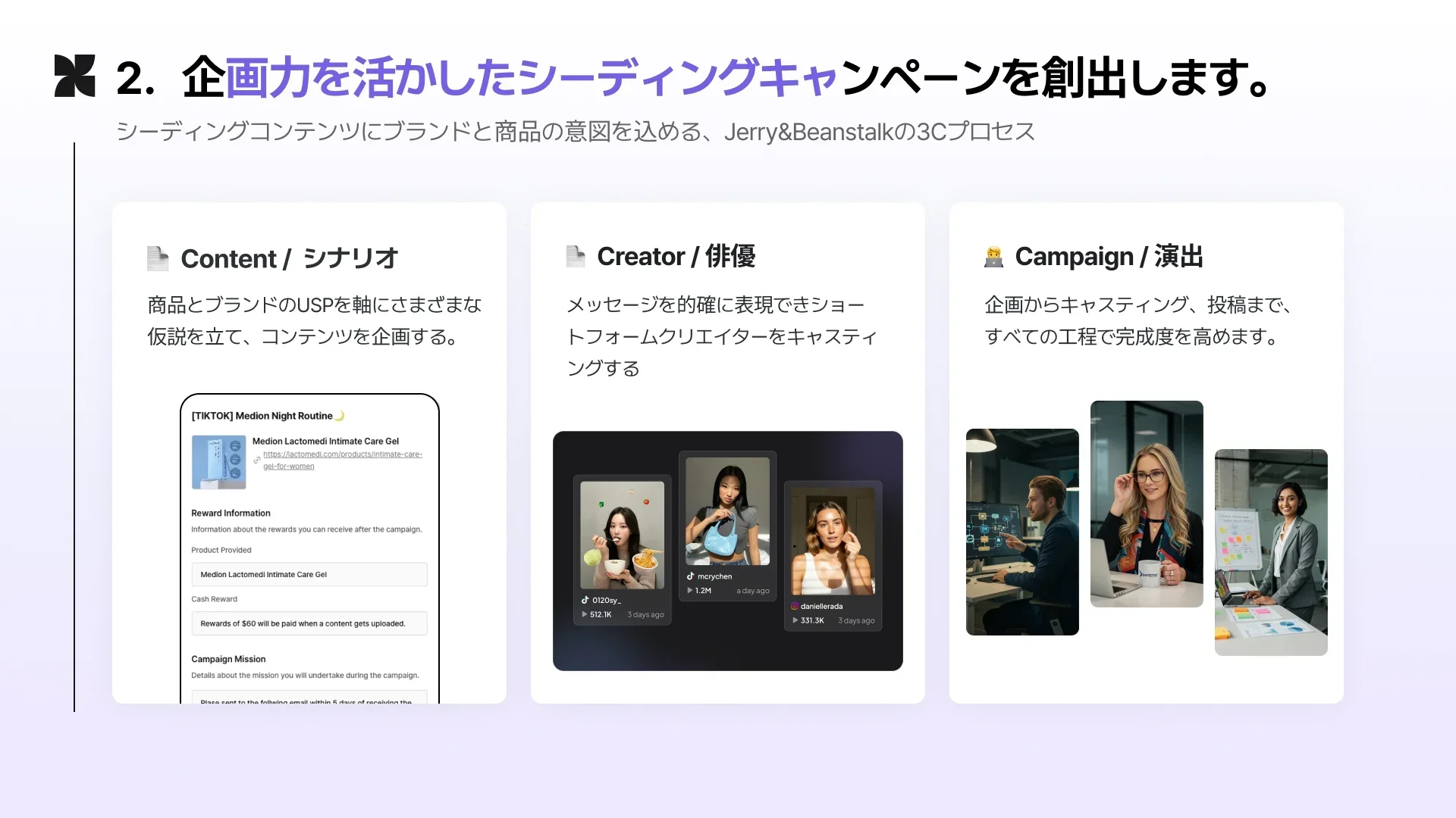 転換型シーディングコンテンツは一般的なシーディングと異なり、鋭い企画力と明確なメッセージで商品の魅力を具体的に示します。
