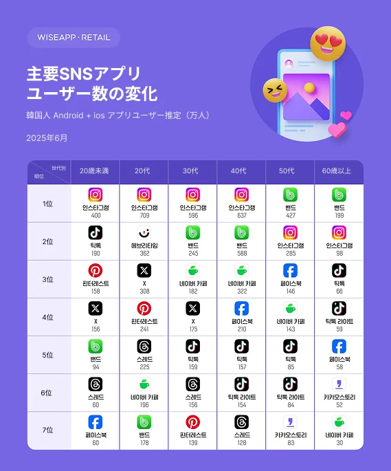 Wiseapp・Retailの「2025年 世代別SNSアプリ利用状況」によると、10代から40代まで全世代でInstagramがユーザー数1位を占め、TikTokとの差も大きく開いていました。