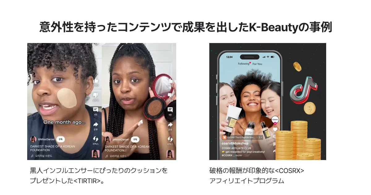 黒人インフルエンサーとのコラボレーションを通じてクッション製品のカバレッジをアピールした<TIRTIR>の事例のように、特定テーマで高い関心と参加を引き出し、全体の売上成長まで達成することができます。