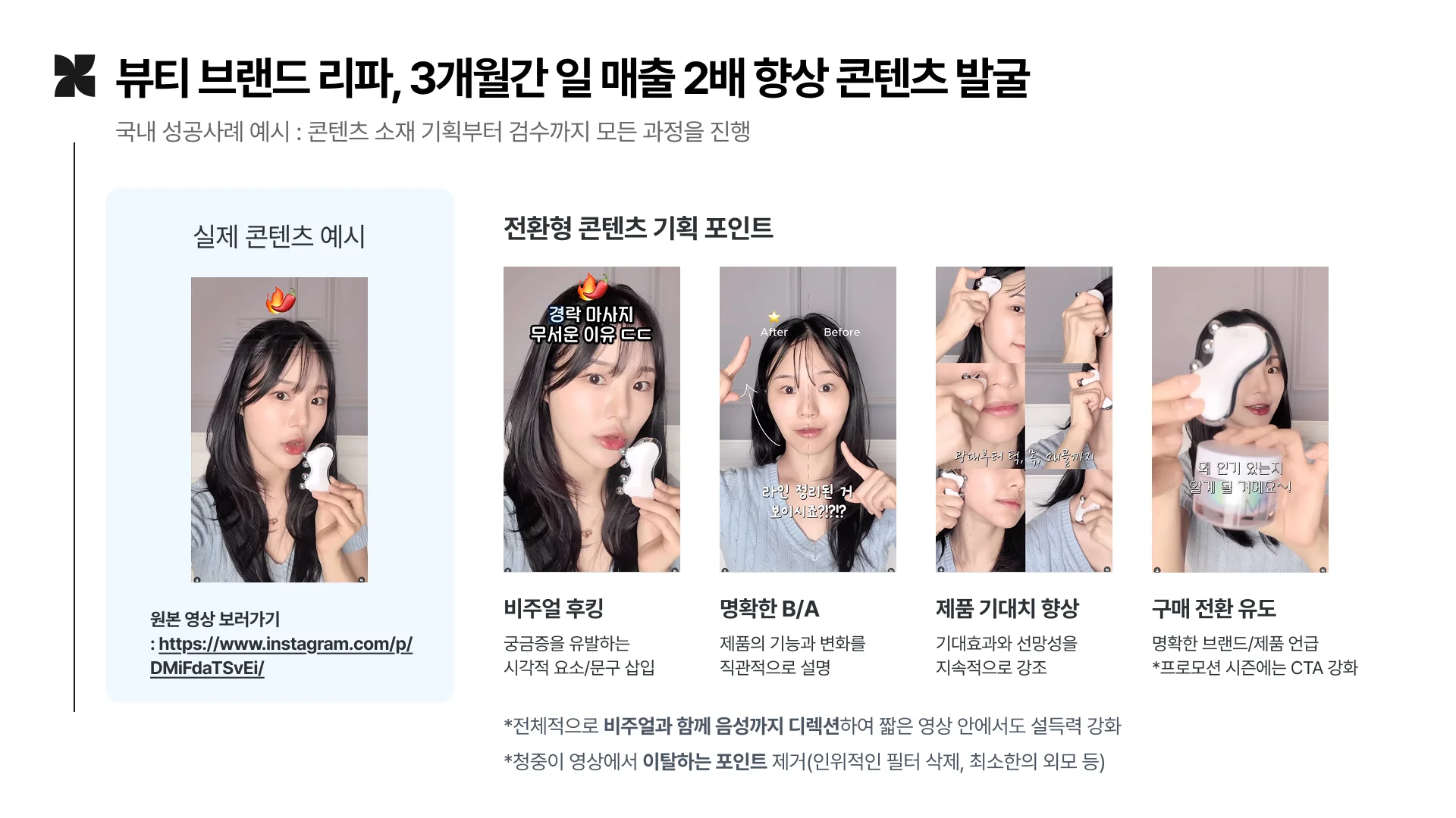 실제로 위에서 언급한 사례의 경우 콘텐츠의 후킹부터 B/A(비포 애프터), 사회적증거와 CTA까지 영상의 초반부터 끝까지의 비주얼과 음성을 모두 디렉션한 덕분에 좋은 성과로 이어질 수 있었습니다.