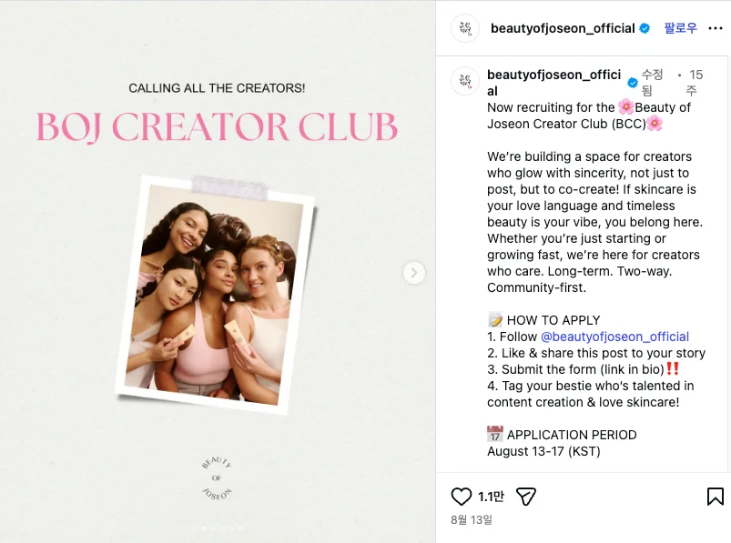 다른 예시로, 국내 뷰티 브랜드 ‘조선미녀(Beauty of Joseon)’는 현지 크리에이터와 장기적인 협업 관계를 만들기 위해서 BOJ 크리에이터 클럽을 운영했는데요.