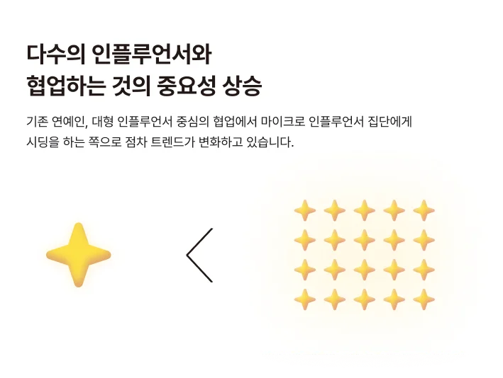 따라서 앞으로는 소수의 거액 인플루언서에 의존하기보다는, 다수의 마이크로 인플루언서와 협업해 비용 대비 효율성을 높이는 전략이 더욱 효과적일 것입니다.