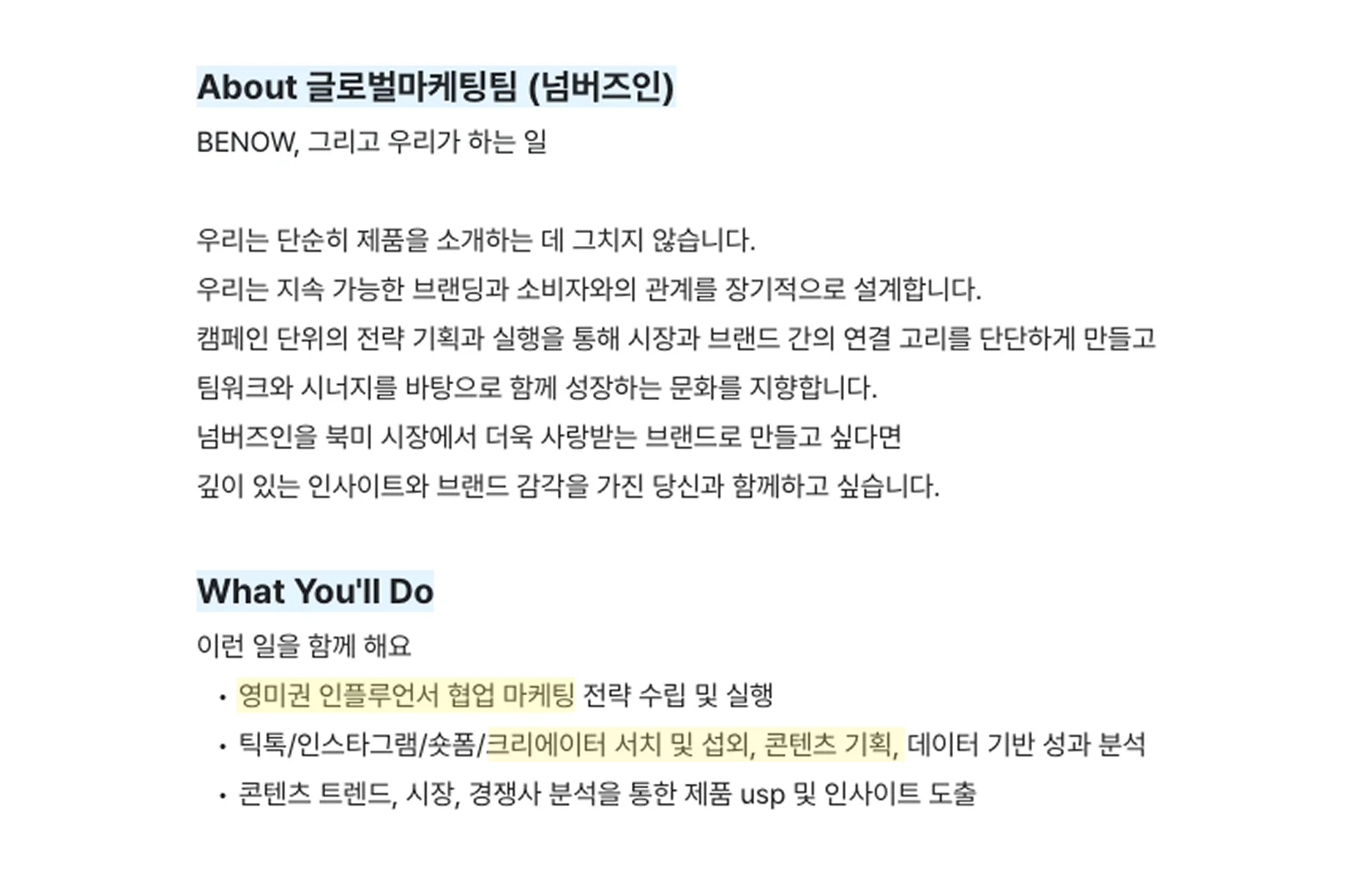 채용공고에 기재된 직무 내용을 요약하면 ‘글로벌 인플루언서 시딩’이 가능한 사람이라 할 수 있습니다.