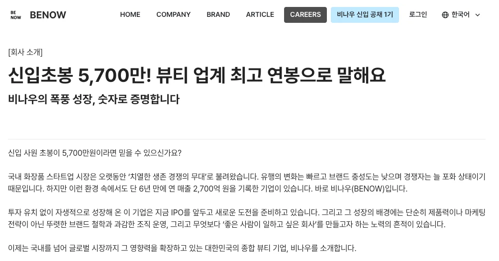 극단적인 사례로 최근 K-뷰티 대표기업 중 하나인 비나우는 신입 마케터 공고에 초봉 5,700만원을 제시하며 업계의 큰 관심을 끌었습니다.