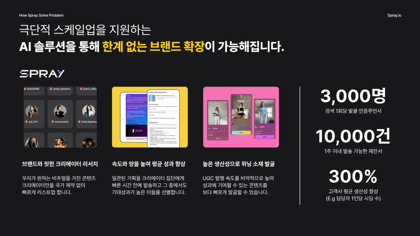 그래서 저희는 AI 시딩 솔루션 ‘스프레이(Spray)’와 글로벌 시딩 마케팅 전문 에이전시 ‘제리와 콩나무(Jerry&Beanstalk)’을 소개하고자 합니다.