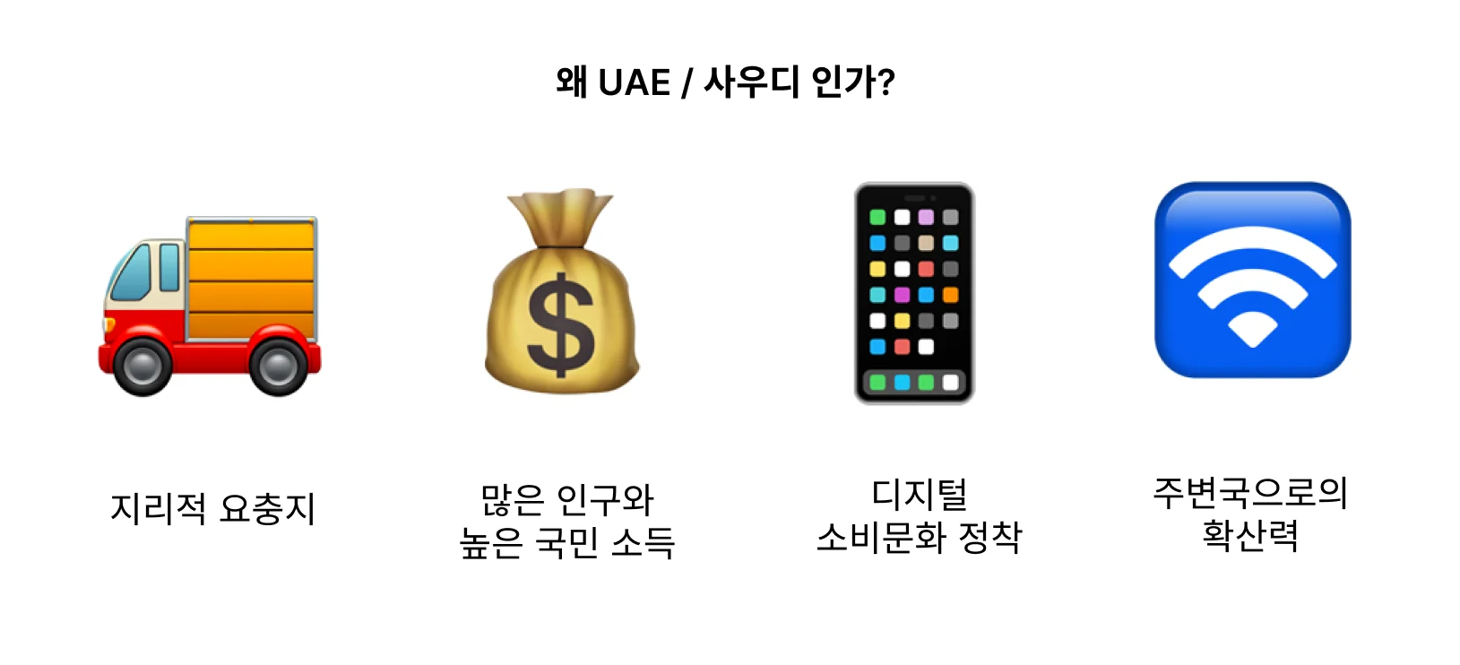 즉, UAE에 진출하는 것만으로도 중동 전역으로 확장할 수 있는 발판을 자연스럽게 마련할 수 있는 것이죠.