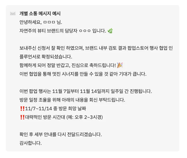 또한 일정 확인 메시지를 보낼 때, “팝업 방문 시 staff 목걸이를 착용한 담당자에게 오시면 안내를 도와드리겠습니다.”와 같이 현장에서의 동선이나 진행 방식에 대한 간단한 안내를 함께 전달하면, 인플루언서의 방문 경험을 원활하게 만들고 현장 관리의 혼선을 줄이는 데도 도움이 됩니다.