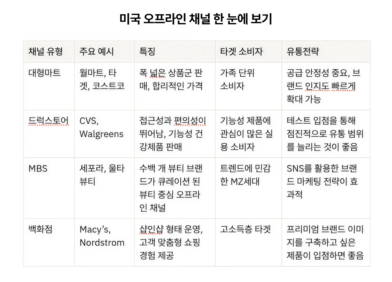 미국의 오프라인 채널은 크게 대형마트, 드럭스토어, MBS, 그리고 백화점으로 크게 네 가지로 나눌 수 있는데요.